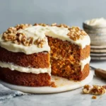 This carrot cake is moist, lightly spiced, and simple to make. You will use fresh grated carrots, olive oil, two kinds of sugar, eggs, and a warm mix of cinnamon and baking powders. The cake bakes into a soft crumb that pairs well with the tangy cream cheese frosting. It works for birthdays, potlucks, and quiet family desserts.