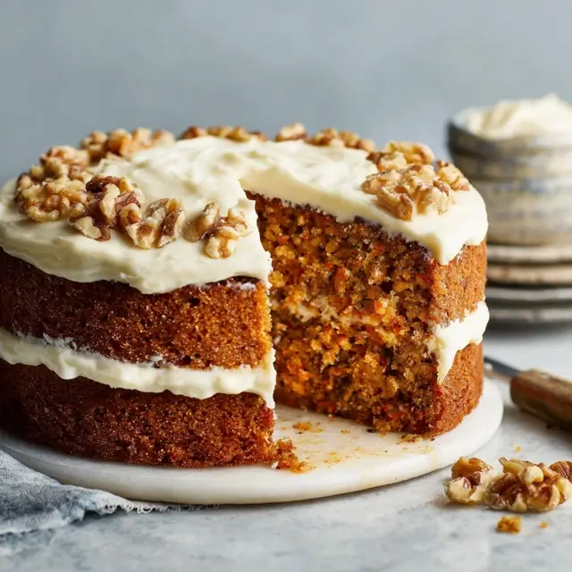 A moist, lightly spiced carrot cake with tangy cream cheese frosting, perfect for any occasion.