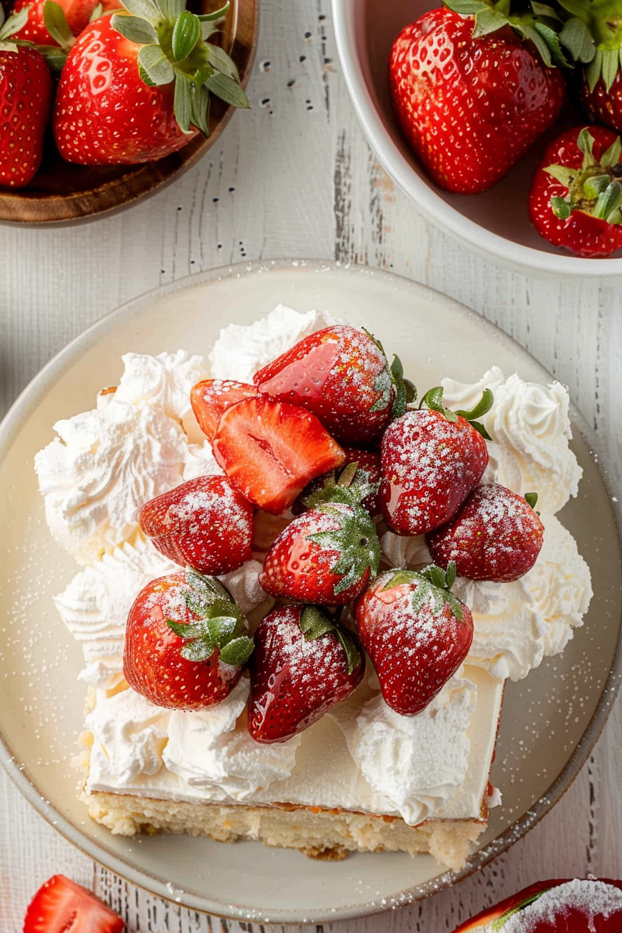 A light, moist white cake soaked in a creamy milk mixture and topped with homemade whipped cream and fresh strawberries. Effortlessly elegant with a tender, bakery-style finish for celebrations or weekend treats.
